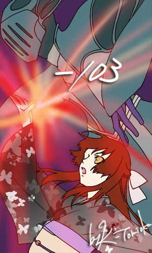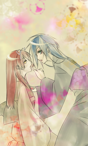 アイツがうちに稽古に 来る様になって暫し。 この間、言われた着物をもって 家に来たケルル。 んでも、其処までで問題発覚。 『こいつ、想った以上に不器用じゃん』 まぁ、流石に口には 出さなかったけど? 新品の紅を(奪い)取って 俺の方へ顔を向ける。 流石に幼い頃からやってりゃ ヒトにやる事も造作ねえ。 折角、顔の造作は良いんだ勿体ねぇ。 化粧は文字通り化ける手段。 間違えた方法で覚えると目も当 てられやしねぇんだ。 紅を引き終わって、鏡の前からど いてやったら不思議な顔して 鏡覗き込んでたな。 自分じゃ無いみたいって心境かもな。 慣れればそれも消えてくだろ。 ――それよりアイツは何を ボンヤリとしてたんだかな。 紅点してる間、心此処に非ずって 来たもんだ。 | │ │ │ │ │ │ │ │ │ │ │ │ │ │ │ │ │ │ │ │ │ │ │ │ │ │ │ │ │ | 今日は舞踊のお稽古がありました。 ケルルはお化粧が嫌いなので あまりしたくないのですが、 お舞台に立つなら慣れておいた ほうがいいと、桔梗君が やってくれました。 終るとなんだかケルルが ケルルではないような気分に なって、とても不思議な 感じがしました。 でもやっぱりケルルは、 自分がお化粧するより 桔梗君が綺麗にお化粧した顔を 見ていたりするほうが楽しいな、 と思いました。 |